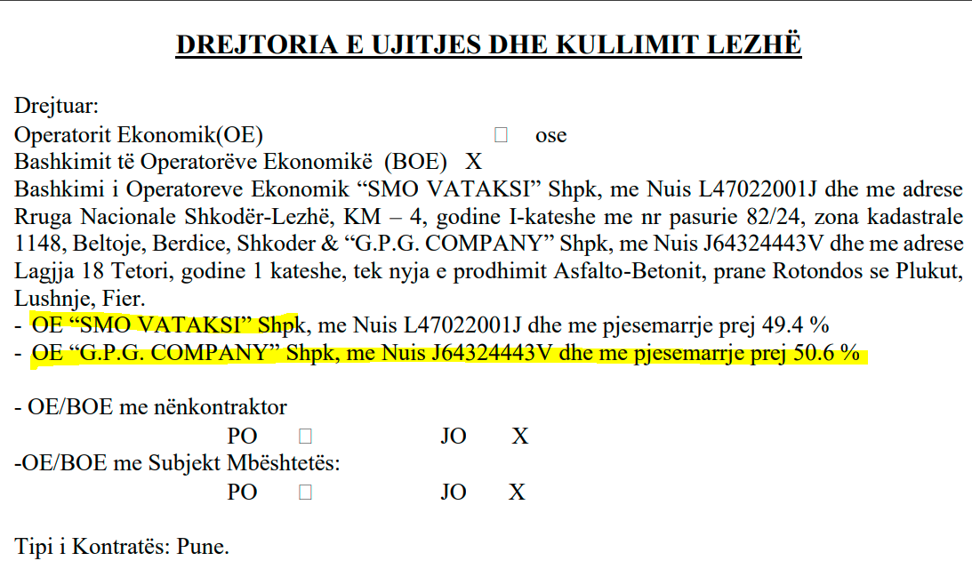 Paqsor Buzi në këtë procedurë ka pasur partner kompaninë me bazë në Shkodër “SMO VATAKSI” Shpk, pronar i së cilës është Xhevat Vataksi.