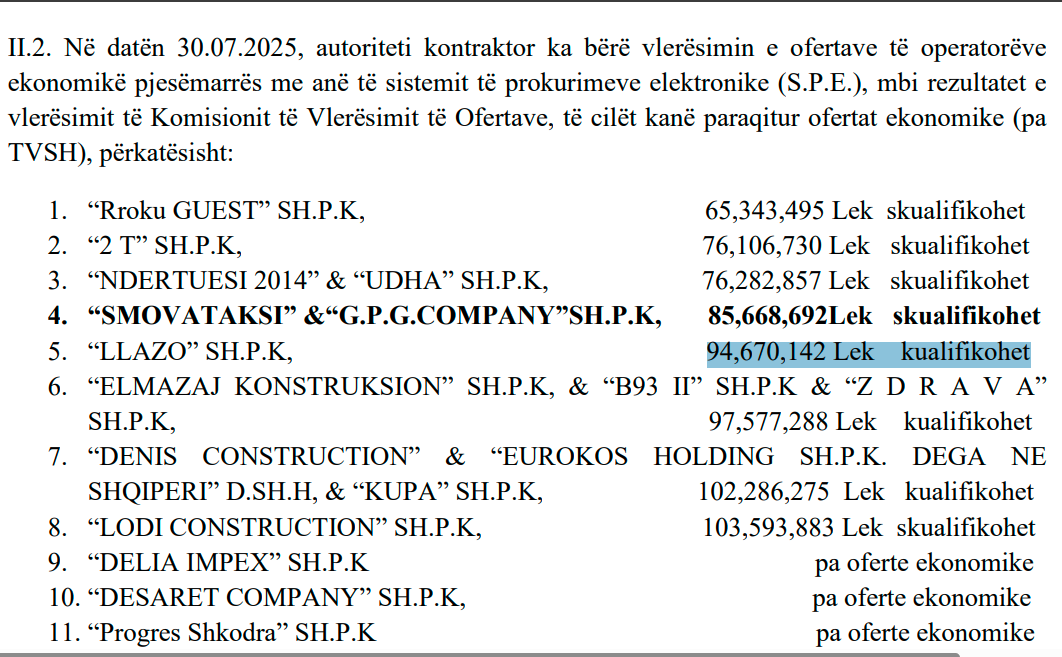 Në tenderin e mbajtur më 27 gusht 2025 morën ojesë 17 operatorë konkurues, por tenderi ka qenë i paracaktuar për oligarkun Poaqsor Buzi që në këtë tender merrte pjesë me kompninë G.P.G. COMPANY” SHPK e bashkuar me firmën “SMO VATAKSI” SHPK. Oferta e Paqsor Buzit ishte 295,285,479 lekë pa TVSH.