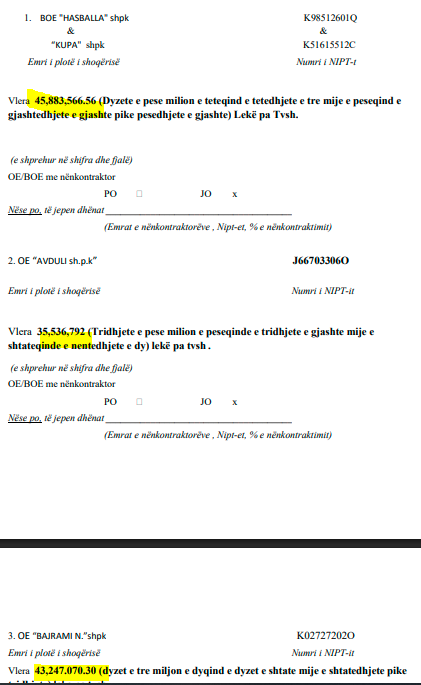 Në këtë procedurë kanë marrë pjesë kompania “K.M.K”, e cila ka paraqitur një ofertë më të ulët se Kupa, por që çuditërisht është tërhequr në momentet e fundit. Loja është e dukshme, duke synuar në diferencë sa më të vogël mes fondit limit dhe ofertës fituese të Kupës, për të ndarë më pas paratë.