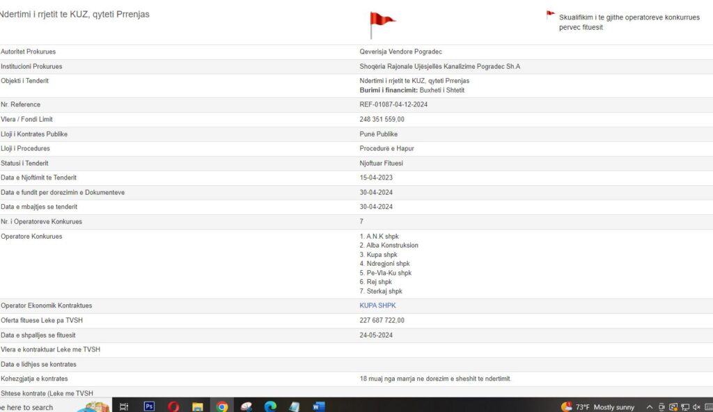 Një tender me vlerë të madhe ku shkëlqen korrupsioni është bërë nga vartësi Belinda Ballukut në Ujësjellësin e Pogradecit. Prokurimi me objekt “Ndërtimi i rrjetit të KUZ, qyteti Prrenjas” u organizua nga UK Pogradec, më më datë 30 prill 2024. Oferta më e lirë është dorëzuar nga firma Alba Konstruksion, me vlerë 1.8 miliardë lekë, por bashkë me 5 kompani të tjera u skualifikuan nga procedura me argumentin se nuk plotësojnë kriteret e vendosura. Në këtë mënyrë në fazën finale mbeti vetëm firma ‘Kupa shpk’ me propozimin 2.3 miliardë lekë.  Edhe ky tender ka marrë “Flamur të kuq” korrupsioni.