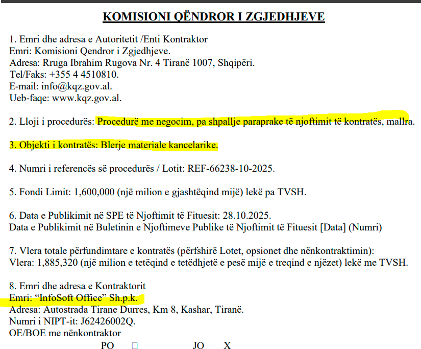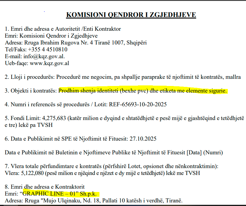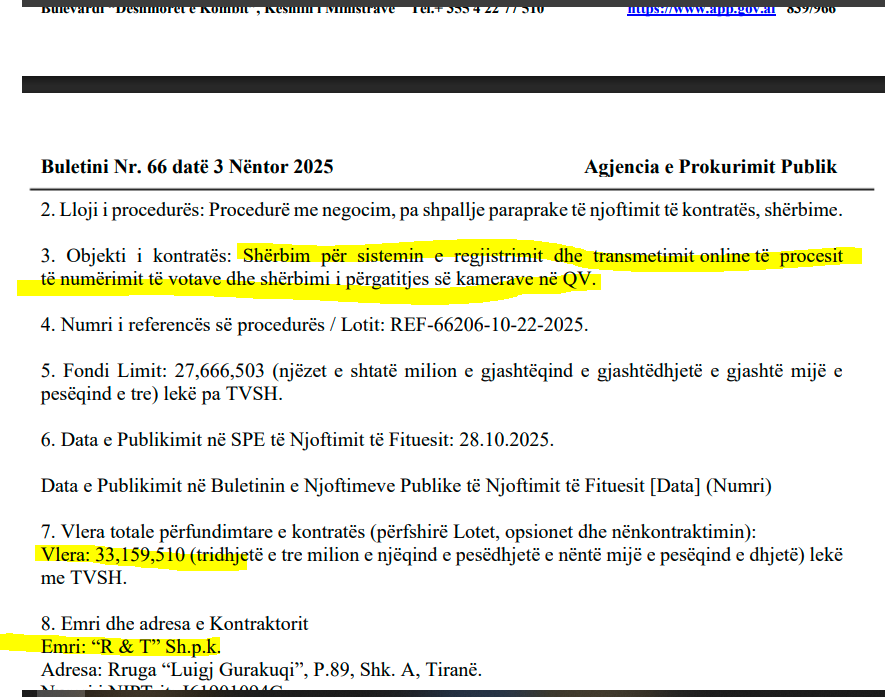 Kontrata e parë ka si objekt “Shërbim për sistemin e regjistrimit dhe transmetimit online të procesit të numërimit të votave dhe shërbimi i përgatitjes së kamerave në QV”.