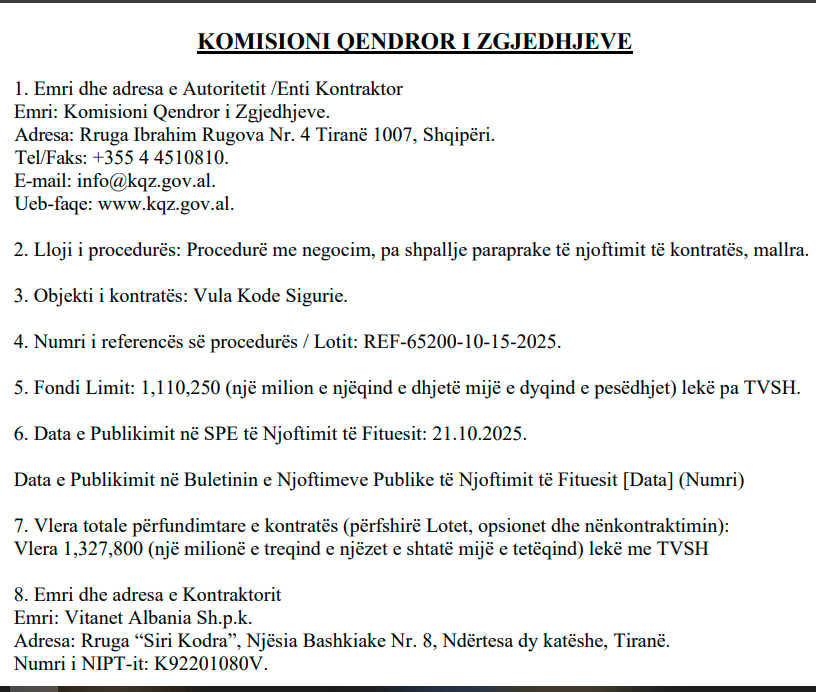 Kjo kontratë është shpallur më 23 tetor 2025 dhe e ka vlerën totale përfundimtare 2,498,400 lekë me TVSH.