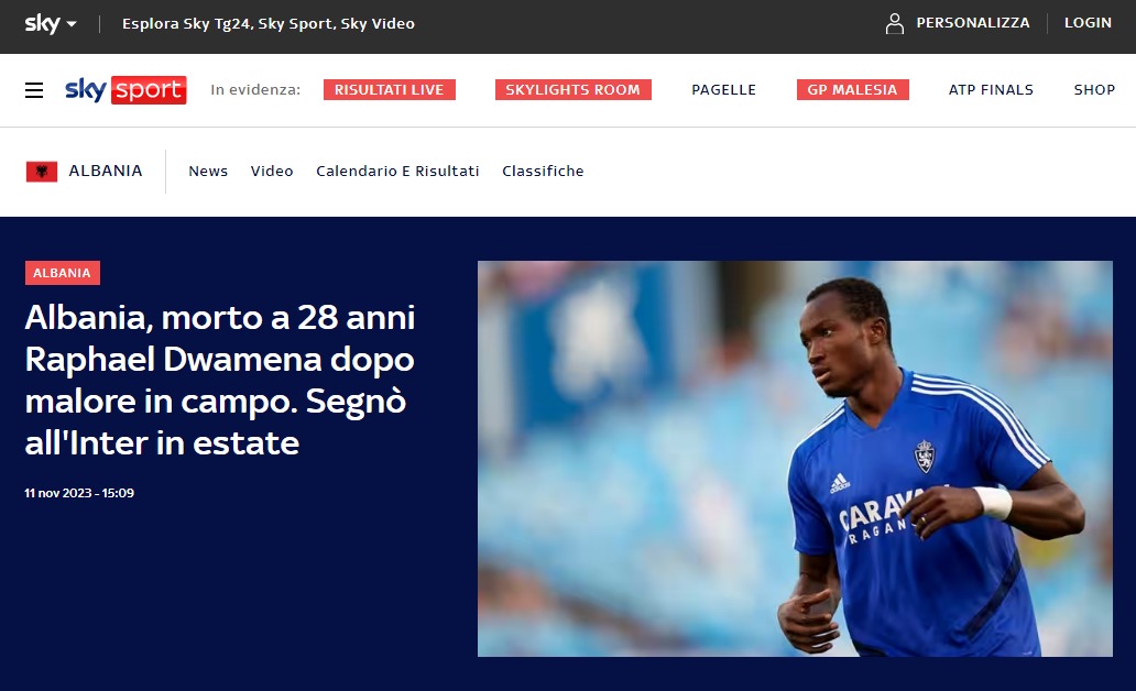 “Sky Sport”: Shqipëri, Rafael Duamena vdes në moshën 28-vjeçare pas kolapsit në fushë, I shënoi Interit në verë.