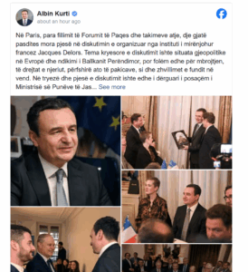 Në një kohë kur në Prishtinë ende nuk është formuar qeveria e re, dhe vendi përballet me pasiguri politike e buxhetore, Kryeministri në detyrë i Republikës së Kosovës, Albin Kurti përdori vizitën në Paris për të rikujtuar, siç tha ai, arritjet e qeverisjes së tij në këto vite.