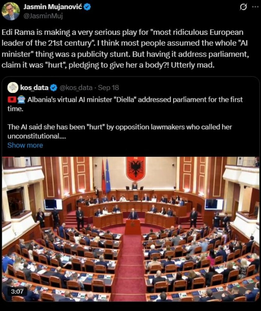 Analisti politik dhe studiuesi i njohur i Ballkanit, Jasmin Mujanović, ka bërë një reagim ironik, pasi Kryeministri Edi Rama emëroi ministren e AI “Diellën”. Me anë të postimi në rrjetin social “X”, Mujanović shkrun se Rama po bën një përpjekje shumë serioze për tu shpallur udhëheqësi më qesharak i Europës në shekullin XXI. Analisti në reagimin e tij ka përmendur edhe momentin në Parlament ku “Diella” mori fjalën dhe u shpreh se ishte e lënduar.