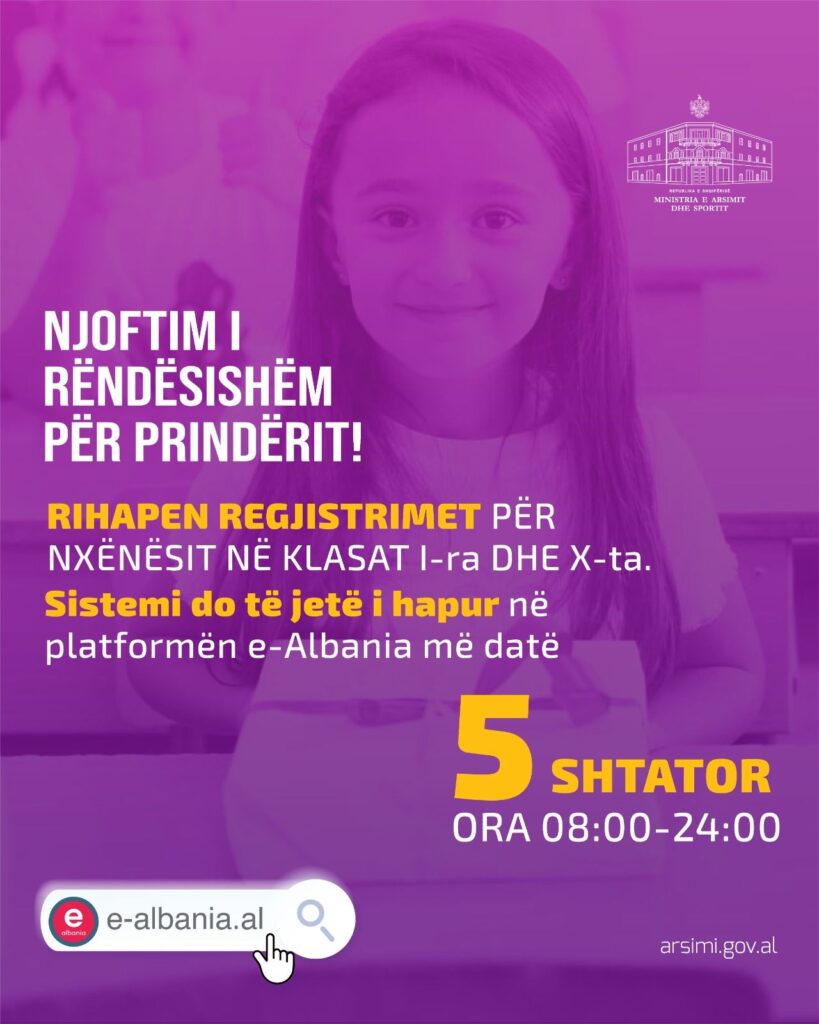 Ministria e Arsimit dhe Sportit ka njoftuar se më datë 5 shtator do të rihapen regjistrimet për nxënësit që do të ndjekin klasën e parë dhe klasën e dhjetë në vitin e ri shkollor.