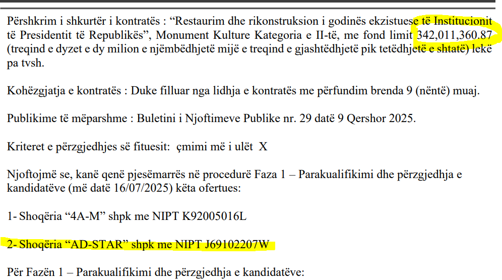 Bëhet fjalë për kontratën me objekt “Restaurim dhe rikonstruksion i godinës ekzistuese të Institucionit të Presidentit të Republikës”, Monument Kulture Kategoria e II-të, me fond limit 342,011,360.87 lekë pa TVSH. Punime të cilat do të zgjasin të paktën 9 muaj.