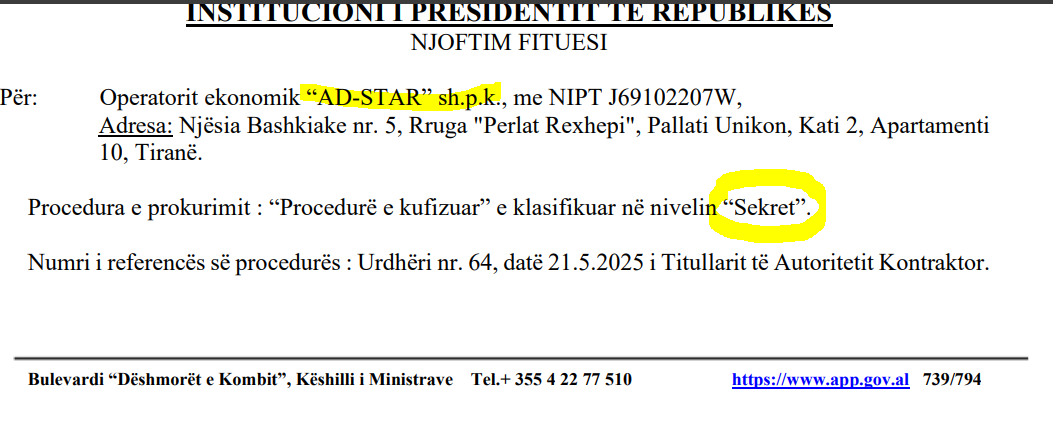 Nga stafi i Presidentit janë thirrur të marrin pjesë në tenderin sekret dy kompani, njëra sa për formalitet dhe tjetra është e Alfred Çomas.