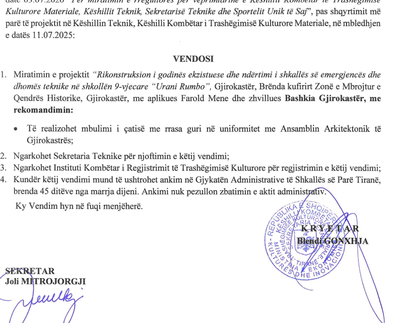 Kjo i shpjegon edhe veprimet e komisionit të tenderit të Bashkisë Gjirokastër i autorizuar nga kryebashkiaku për të prokuruar rikonstruksionin e shkollës “Urani Rumbo”. Po si u mbyllka institucioni në mes të vitit shkollor? Në këtë projekt ka gisht edhe Blendi Gonxhe. Me dorën e tij e ka miratuar projektin për rinkonstruksionin e shkollës, e cila është trashëgimi kulturore.