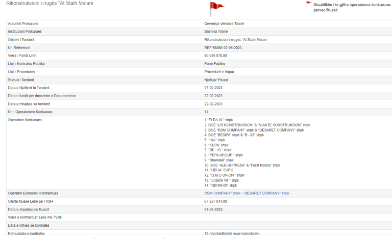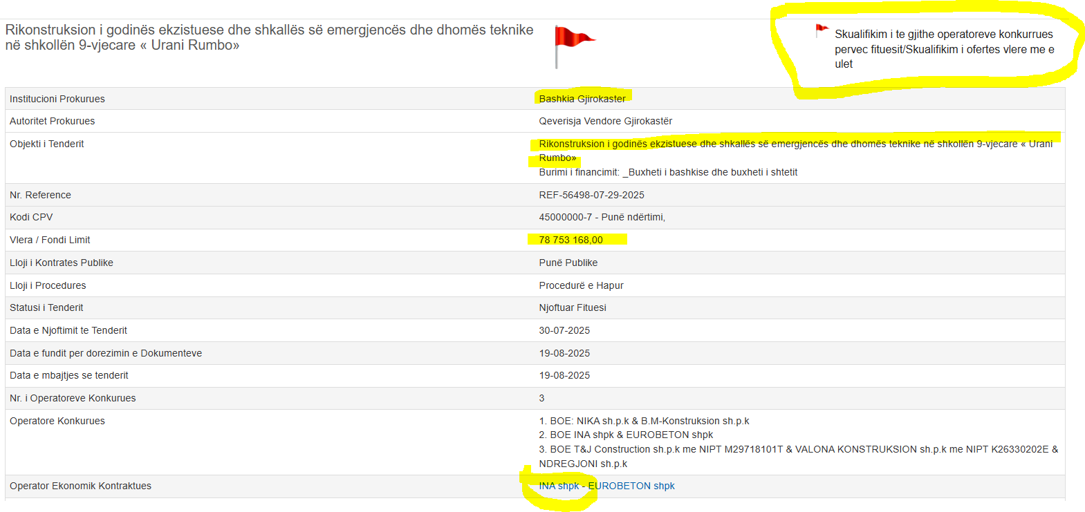 Më konkretisht bëhet fjalë për tenderin e Bashkisë Gjirokastër me objekt “Rikonstruksion i godinës ekzistuese dhe shkallës së emergjencës dhe dhomës teknike në shkollën 9-vjecare «Urani Rumbo»” me vlerën e Fondit Limit të projektit 78 753 168,00 lekë pa TVSH.