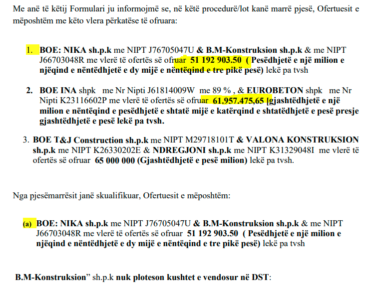 Por Bashkimi i Operatorëve Ekonomik “NIKA” sh.p.k & “B.M-Konstruksion” sh.p.k ofroi ta bëjë këtë punë me 51 192 903.50 lekë pa tvsh. Kjo diferencë prej 100 milionë lekësh nuk e ka nxitur komisionin që të ta konsiderojë ofertën. Përkundrazi, operatori është skualififikuar dhe tenderi ka vazhduar me Ferdinand Caushin dhe kompaninë tjetër që kishte ofertë të ngjashme.