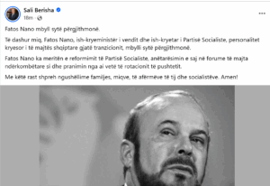 Kryetari i PD Sali Berisha ka reaguar per ndarjen nga jeta te ish-kryeministrit dhe ish-kryetarit te Partisë Socialiste, Fatos Nano. Duke shprehur ngushëllimet e tij Berisha theksoi se Fatos Nano, ish-kryeministër i vendit dhe ish-kryetar i Partisë Socialiste, ishte personalitet kryesor i të majtës shqiptare gjatë tranzicionit,