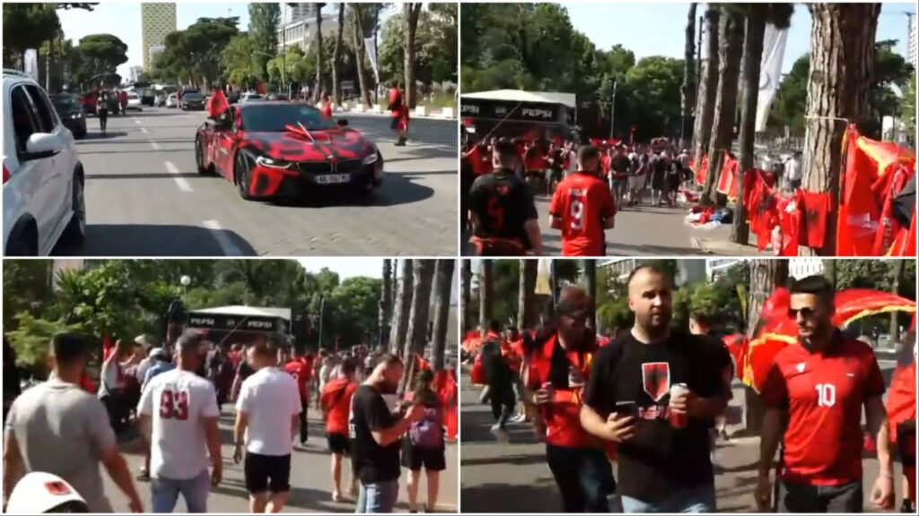 Nuk mungojnë këngët patriotike, ndërsa mbështetës të shumtë, kanë mbuluar makinat e tyre me flamujt e Shqipërisë.