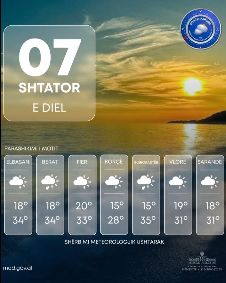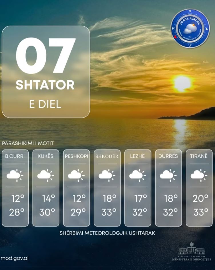 Ditën e Diel, vendi ynë do të ndikohet nga kushte atmosferike të qëndrueshme. Moti parashikohet me kthjellime si dhe alternime vranësirash mesatare dhe hera-herës deri të dendura dhe kryesisht në relievet malore në lindje si dhe zonën e jugut.