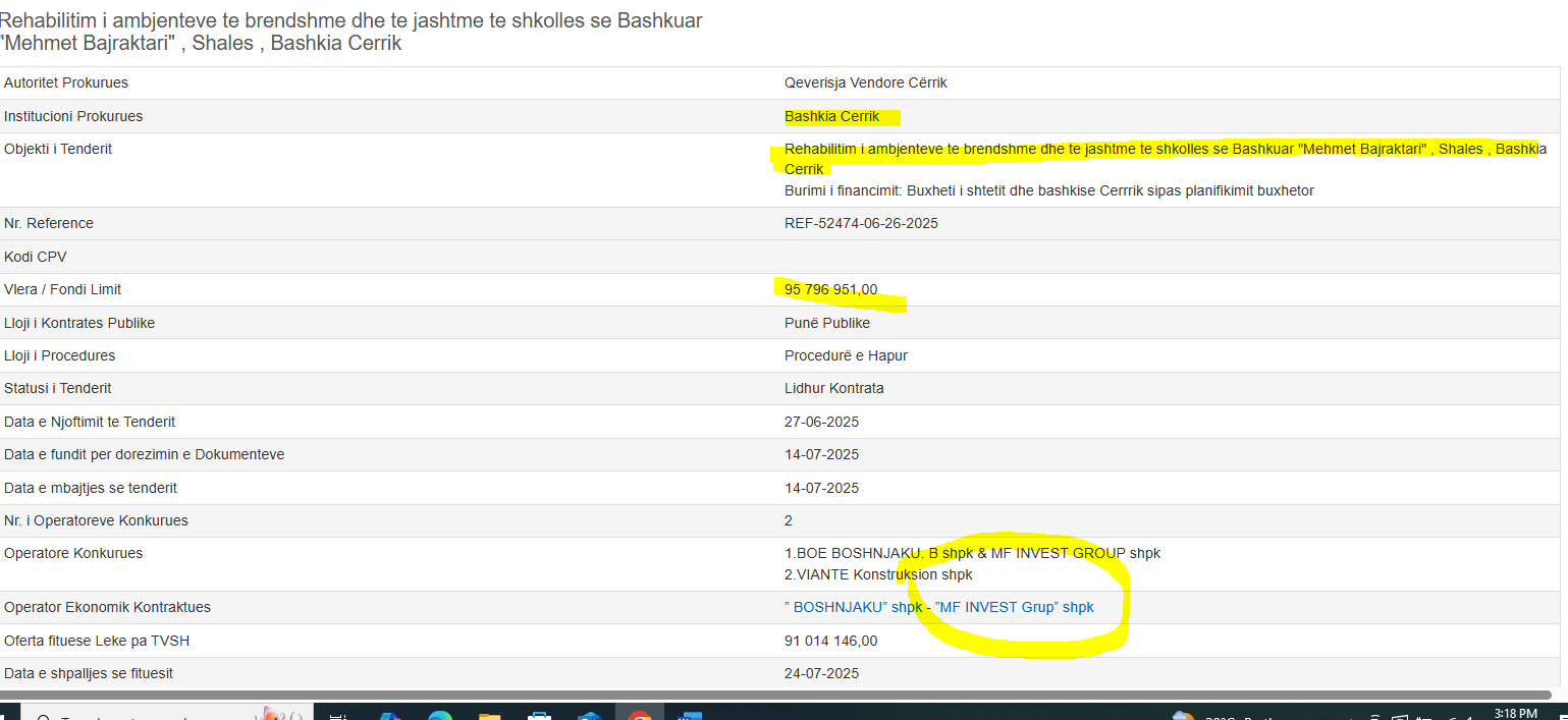 Konkretisht, “MF INVEST GROUP” shpk më 15 gusht 2025 ka nënshkruar kontratë me Bashkinë Cërrik për tenderin “Rehabilitim i ambjenteve të brendshme dhe të jashtme të shkollës së Bashkuar “Mehmet Bajraktari” , Shalës , Bashkia Cerrik”. Vlera e kësaj kontrate është 109 216 975,00 lekë pa TVSH, ndërsa kohëzgjatja është 4 muaj. Në këtë kantier, kompania në mënyrë solidare me një firmë tjetër ka marrë përsipër të angazhojë 120 punonjës dhe një listë me mjete dhe pajisje.