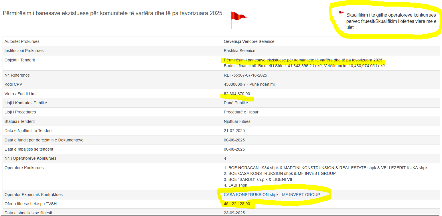 Bashkimi i operatorëve ekonomikë “CASA KONSTRUKSION” shpk & “MF INVEST GROUP” shpk prezantoi ofertën 45 122 128,00 lekë pa TVSH. Megjithëse kishte oferta më të ulëta, “CASA KONSTRUKSION” shpk me pronare Aurela Dlulla dhe kompania tjetër me pronar Dritan Metën u shpallën fitues më 23 shtator 2025.