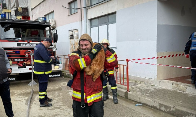 Zjarrfikësi në foto, u bë sot dhe “heroi” i një maceje teksa e shpëtoi nga flakët dhe tymi që përfshiu një banesë në Shkozë. “Mirënjohja” e maces mesa duket është treguar ndërsa kjo e fundit qëndonte dhe nuk i hiqej nga krahët zjarrfikësit.