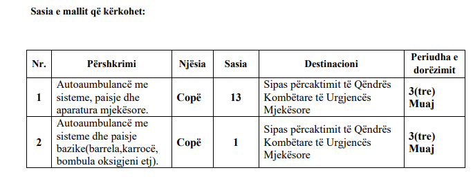 Me këto lekë do të blihen 14 autoambulanca, ku njëra prej të cilave do të ketë pajisje ndihmëse bazë si në sallën operatore. Ndërsa mjetet duhet të dorëzohen brenda 3 muajve nga dita e nënshkrimit të kontratës.