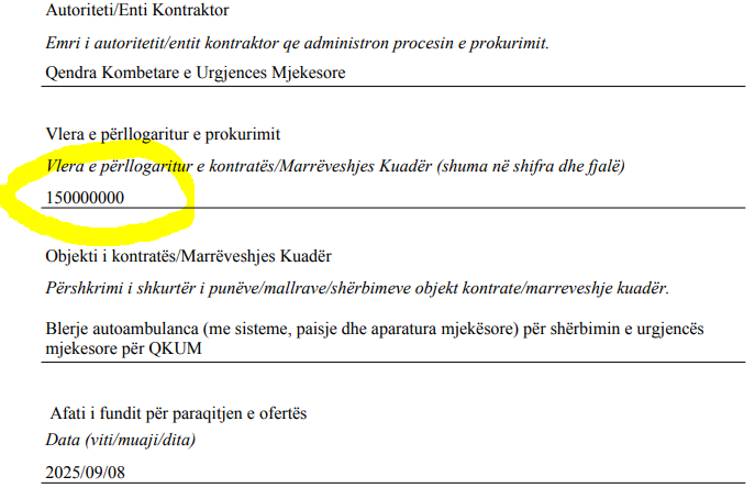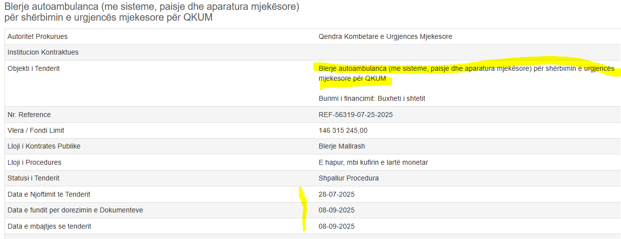 Më konkretisht, tenderi me objekt Blerje autoambulanca (me sisteme, pajisje dhe aparatura mjekësore) për shërbimin e urgjencës mjekësore për QKUM, u shpall më 28 korrik 2025. Fondi limit për blerjen e ambulancave është caktuar 146 315 245,00 lekë pa TVSH