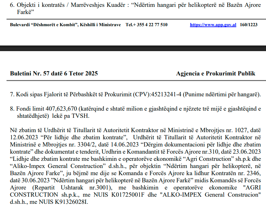 Kujtojmë se tenderi me objekt “Ndërtim hangari për helikopterë në Bazën Ajrore Farkë” e kishte fondin limit 407,623,670 lekë pa TVSH.