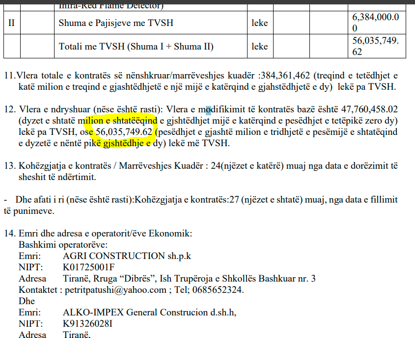 Vlera e modifikimit të kontratës bazë është 47,760,458.02 lekë pa TVSH, sipas një preventivi shtesë të paraqitur nga zbatuesi i punimeve lekë. Duke futur TVSH, shtesa është 56,035,749.62 lekë.