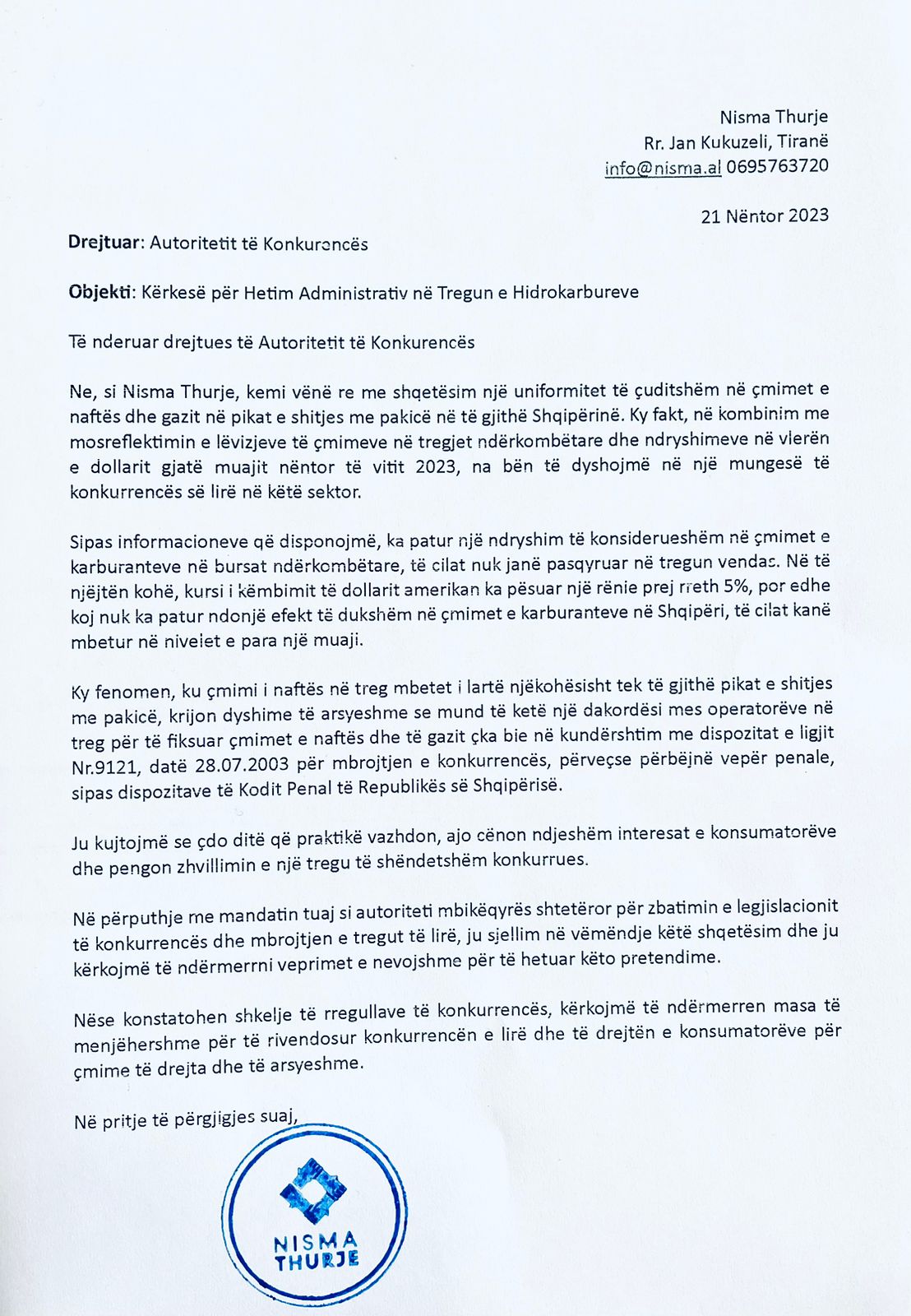 Ditën e sotme ‘Nisma Thurje’ i është drejtuar Autoritetit të Konkurrencës për t’i kërkuar nisjen e hetimit për çmimin e naftës dhe të gazit në tregun e pakicës, pasi dyshohet për marrëveshje kartel.