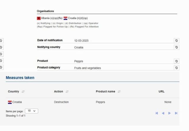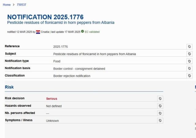 Më 12 Mars, përmes sistemit të alarmeve të shpejta të BE-së (RASFF), një ngarkesë me speca nga Shqipëria, që kishte nivele të larta pesticidësh, u ndalua në Kroaci.