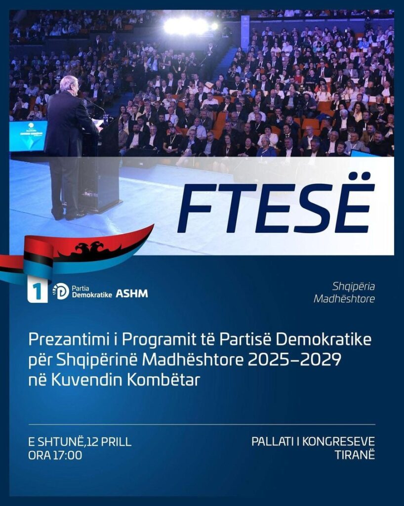 “Në ora 17:00, me prezencën e Kryetarit të PD, Prof. Dr. Sali Berisha, Partia Demokratike dhe ASHM shpalosin programin për Shqipërinë Madhështore 2025-2029 në Kuvendin Kombëtar tek Pallati i Kongreseve, Tiranë”, thuhet në njoftimin e PD-së.