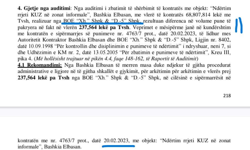 Në një raport të kohëve të fundit të KLSH, për veprimtarinë e Bashkisë Elbasan, përfshihet edhe konkluzioni i auditimit të procedurës tenderuese me objekt ‘ndërtim rrjeti KUZ në zonat informale’. Sipas KLSH-së, kompanitë e Agim Krajës dhe Hajredin Ukperajt kanë mashtruar me zbatimin e kontratës, duke falsifikuar volumin e punimeve dhe u janë certifikuar punime të pakryera.