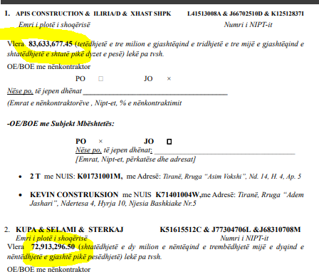 Konkretisht, bashkimi i operatorëve ekonomikë “KUPA” shpk & “SELAMI” shpk & “STERKAJ” shpk ofroi ta bënte këtë punë me 72,913,296.50 lekë pa tvsh.