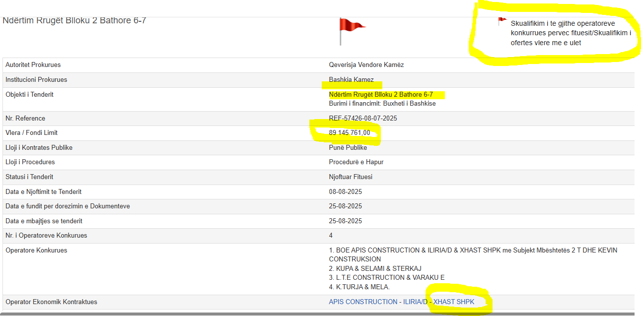 Në tenderin e mbajtur më 25 gusht 2025 janë përjashtuar nga gara të gjithë pjesëmarrësit që të fitonte kompania e këshilltarit bashkiak. “Skualifikim i të gjithë operatorëve konkurrues përveç fituesit/ Skualifikim i ofertës me vlerë më të ulët”, ky është klasifikimi që i bën tenderit Open Data Albania. Theksojmë se procedura është shënuar me “Flamur të kuq”, që tregon riskun e korrupsionit.
