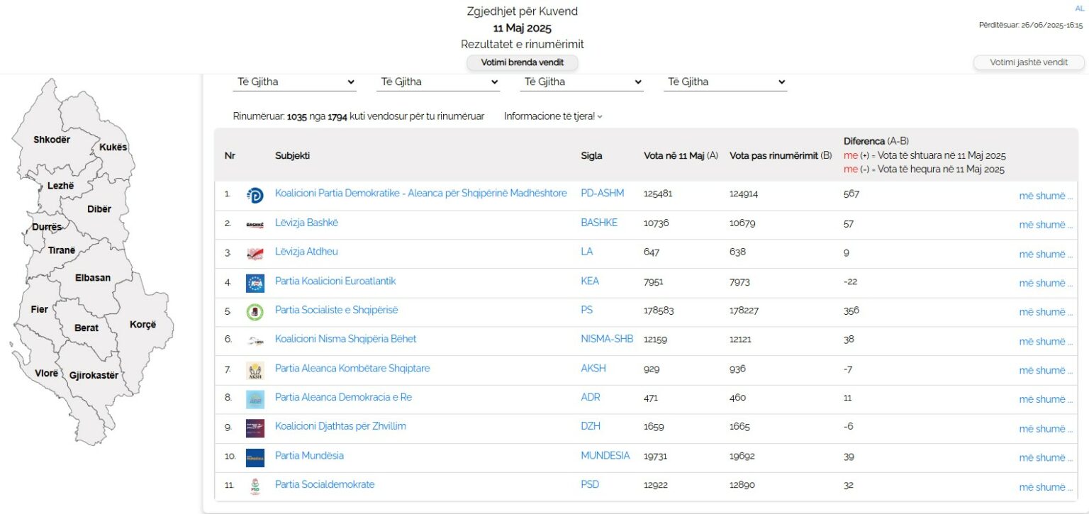 Ekipet e numërimit të KQZ kanë rivlerësuar mbi 80% të kutive të Qarkut të Tiranës. Deri tani janë numëruar 1035 kuti votimi nga 1282 në total.