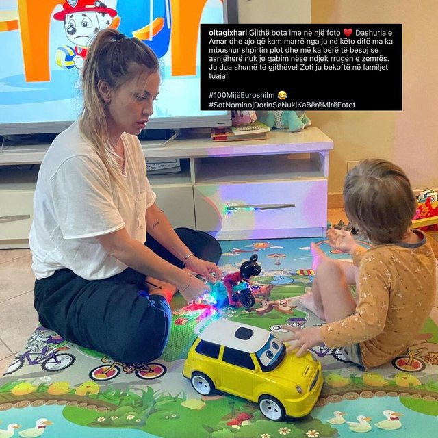 “Gjithë bota ime në një foto ♥? Dashuria e Amar dhe ajo që kam marrë nga ju në këto ditë ma ka mbushur shpirtin plot dhe më ka bërë të besoj se asnjëherë nuk je gabim nëse ndjek rrugën e zemrës. Ju dua shumë të gjithëve! Zoti ju bekoftë në familjet tuaja! #100MijëEuroshiIm ???? #Sot NominojDorinSeNukIKaBërëMirëFotot”.