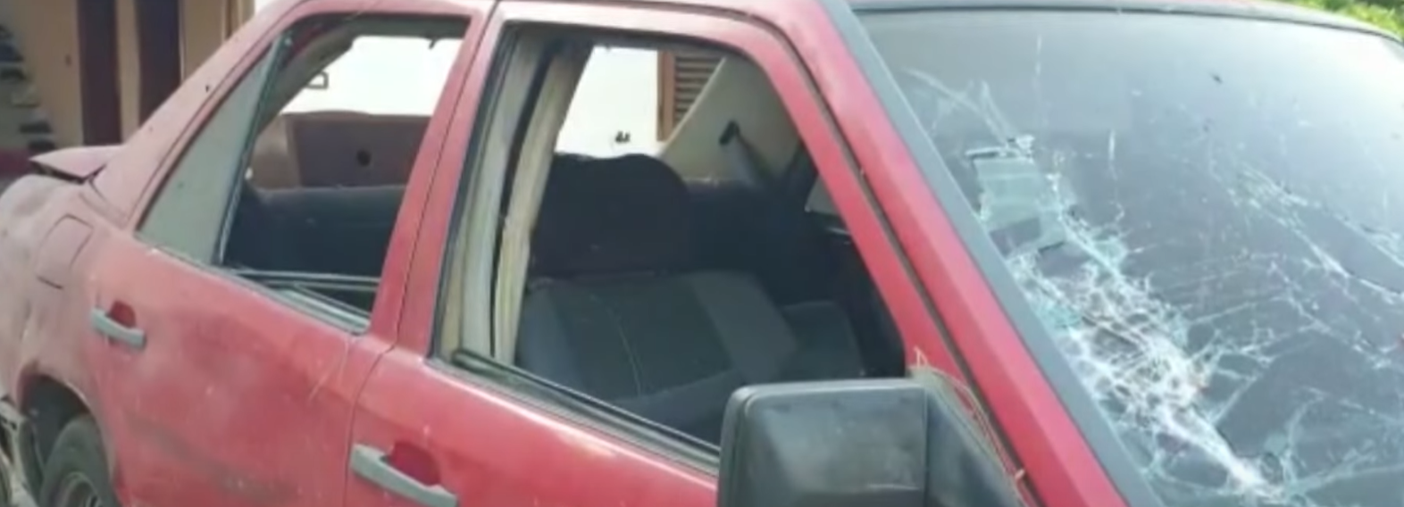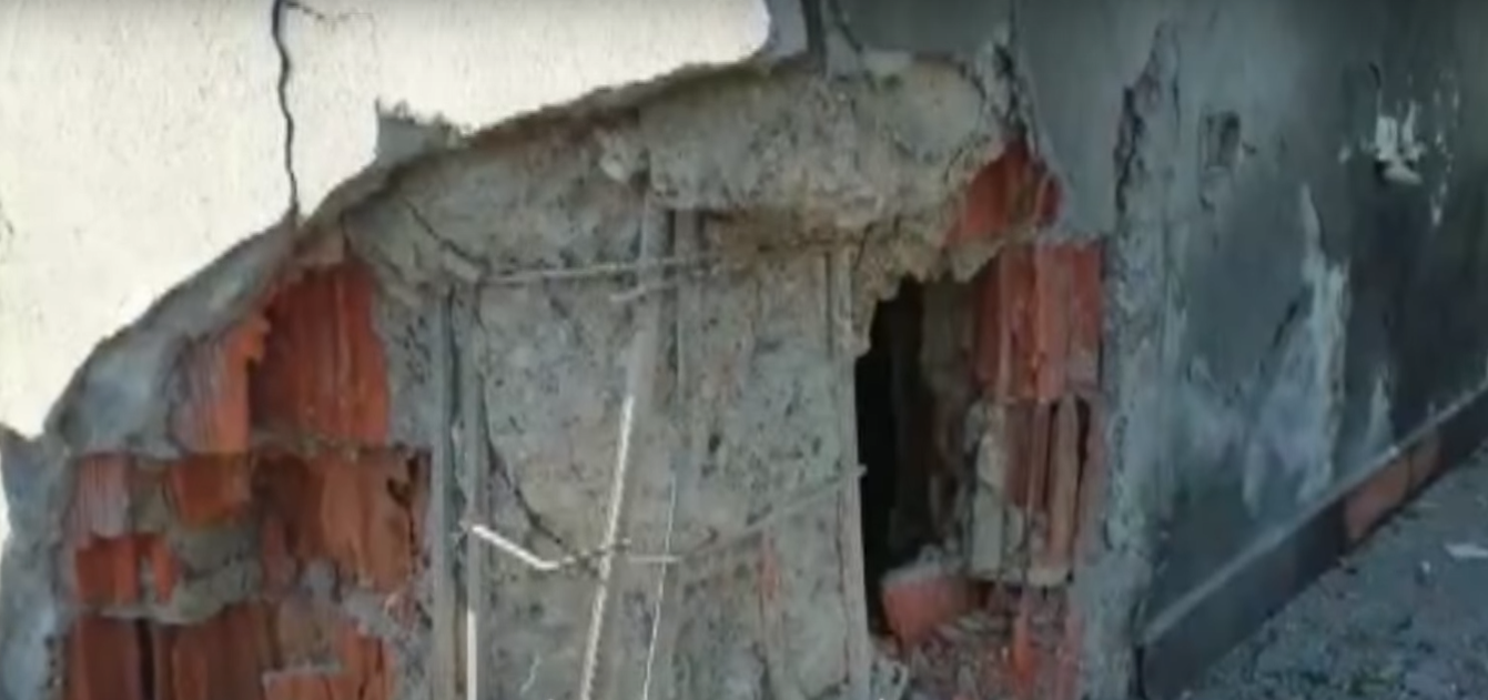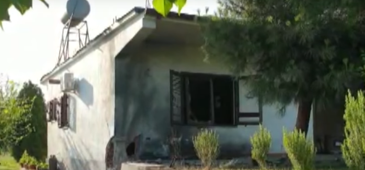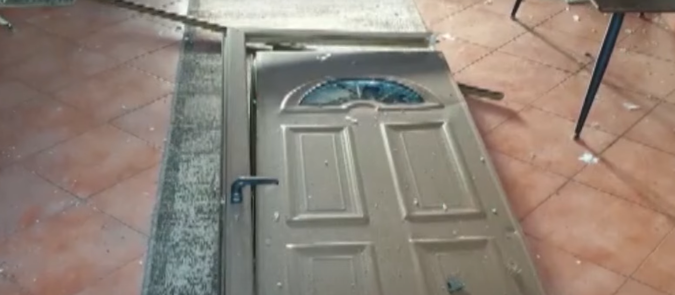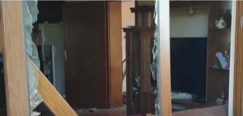 Pamjet tregojnë derën e rrëzuar, dritaren e shkatërruar totalisht, si dhe muret e dëmtuara dhe oborrin të mbushur plot me xhama.