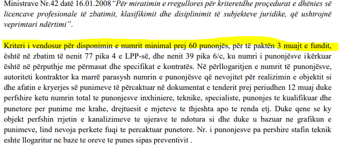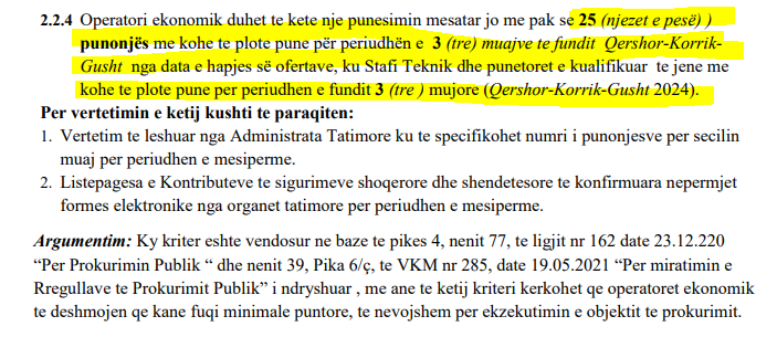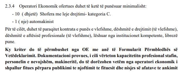 Sipas dokumenteve të tenderit të zhvilluar në dhjetor 2024, operatori ekonomik ofertues duhet të ketë të punësuar minimalisht: -3 shoferë- 1 automakinist, minimalisht 3 kamionë vetëshkarkues me kapacitet mbajtës minimumi 18 ton,  minimalisht 1 autobitumatriçe.