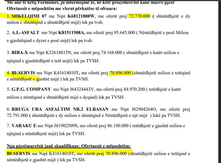 Nuk ka se si shpjegohet që operatori ekonomik SHKELQIMI 07 SHPK fiton me ofertën 72 770 000,00 lekë pa TVSH, që është më e lartë se sa propozimi i bërë nga një kompani tjetër që është skualifikuar.