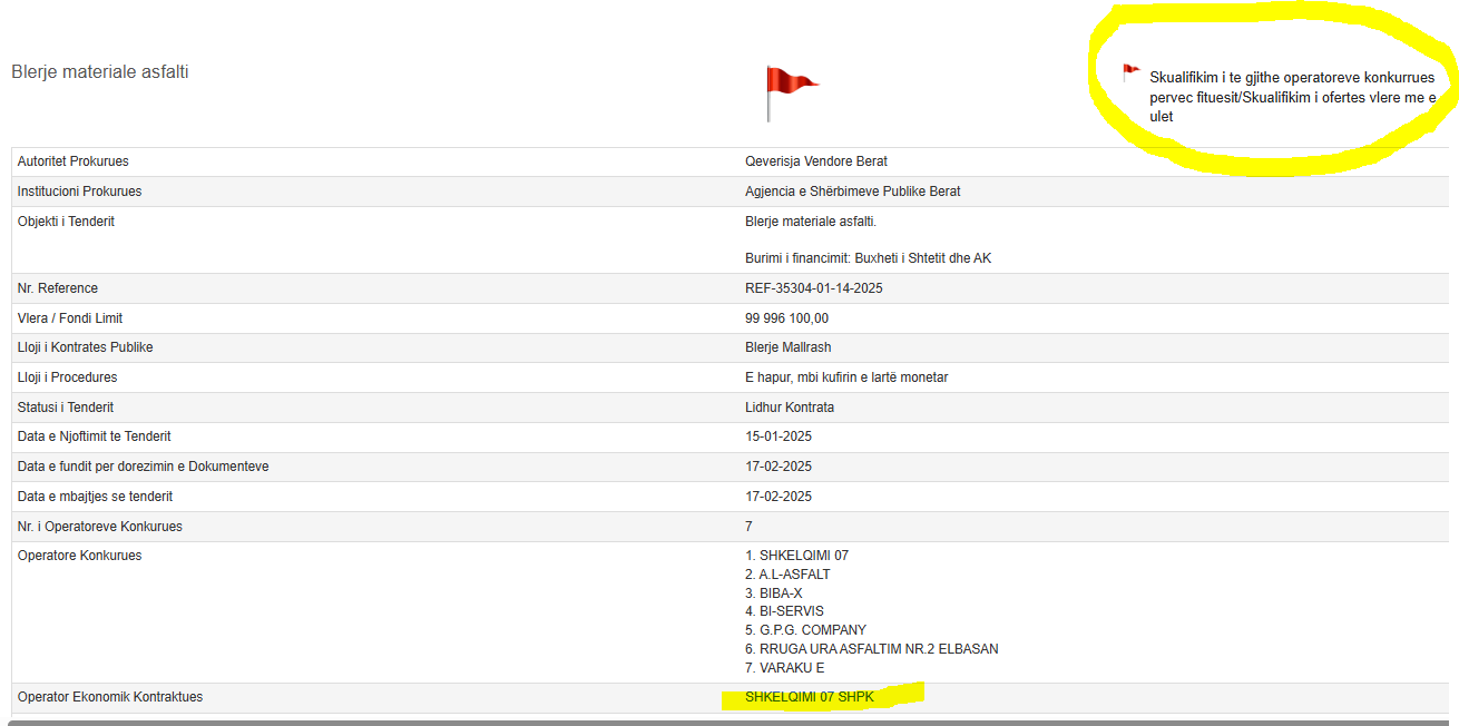 Më konkretisht, bëhet fjalë për tenderin me objekt “Blerje materiale asfalti” me fondin limit 99 996 100,00 lekë. Megjithëse në procedurë e prokurimit janë paraqitur 7 kompani me oferta të ndryshme, të dhënat tregojnë se ky është një tender fiktiv me fitues të paracaktuar.