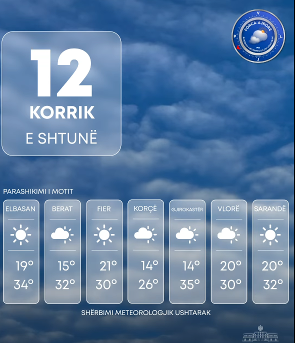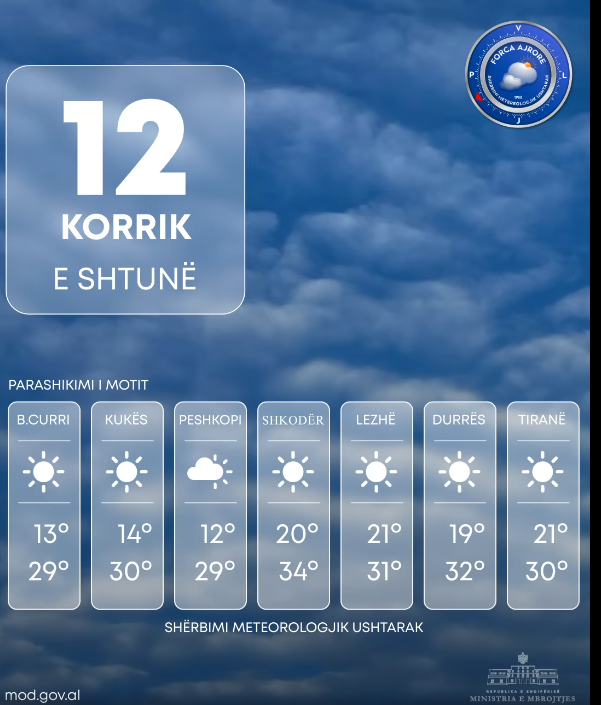 Sipas SHMU, moti parashikohet i kthjellët në të gjithë territorin pa përjashtuar alternimet e vranësirave mesatare dhe hera-herës deri të dendura kryesisht në relievet malore nga orët e mesditës deri ato të pasdites.
