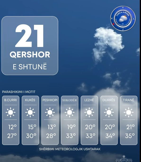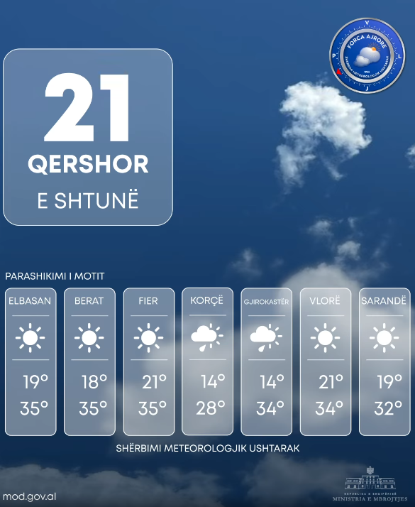 Vendi ynë do të mbetet nën ndikimin e motit të kthjellët deri vonë pasdite kur priten kalime vranësirash të shpeshta nëpër të gjithë territorin. Më të theksuara vranësirat paraqiten në gjysmën Lindore të Shqipërisë. Parashikohet që mbrëmja dhe nata të vijojnë nën dominimin e kthjellimeve vranësirave dhe lagështirës së lartë në ajër.
