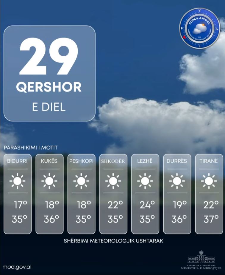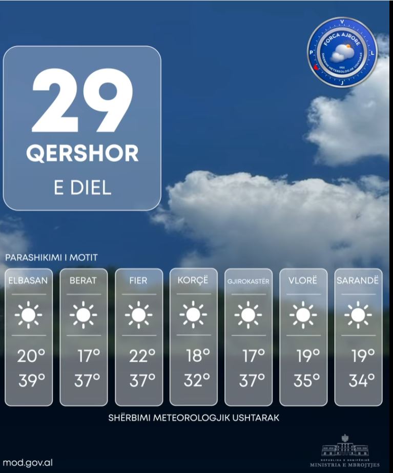 Vendi ynë do të jetë nën ndikimin e kushteve atmosferike të qëndrueshme, si pasojë e depërtimit të masave ajrore me origjinë nga veriu i Afrikës si dhe ndikimi i Anticiklinoni i Azoreve. Moti parashikohet i kthjellët në të gjithë territorin.