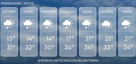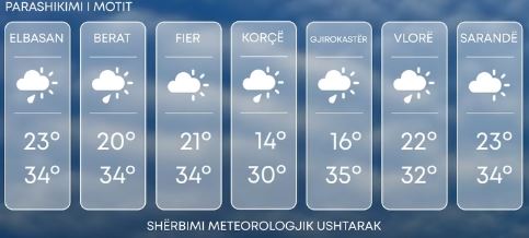 Sipas Shërbimit Meteorokogjik Ushtarak moti parashikohet fillimisht i kthjellët, me vranësira në shtim nga orët e mesditës e pasdites, më të theksuara përgjatë relieveve malore në lindje e juglindje.