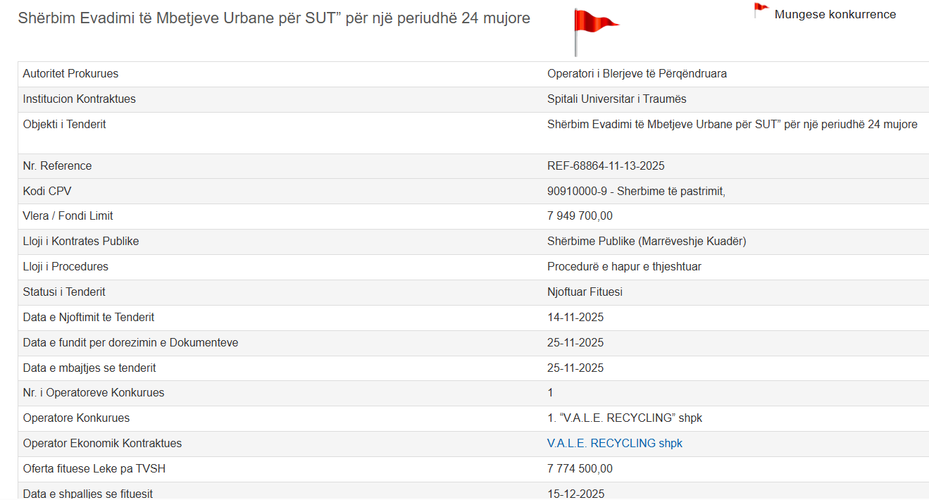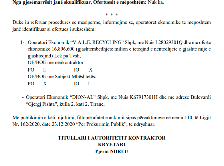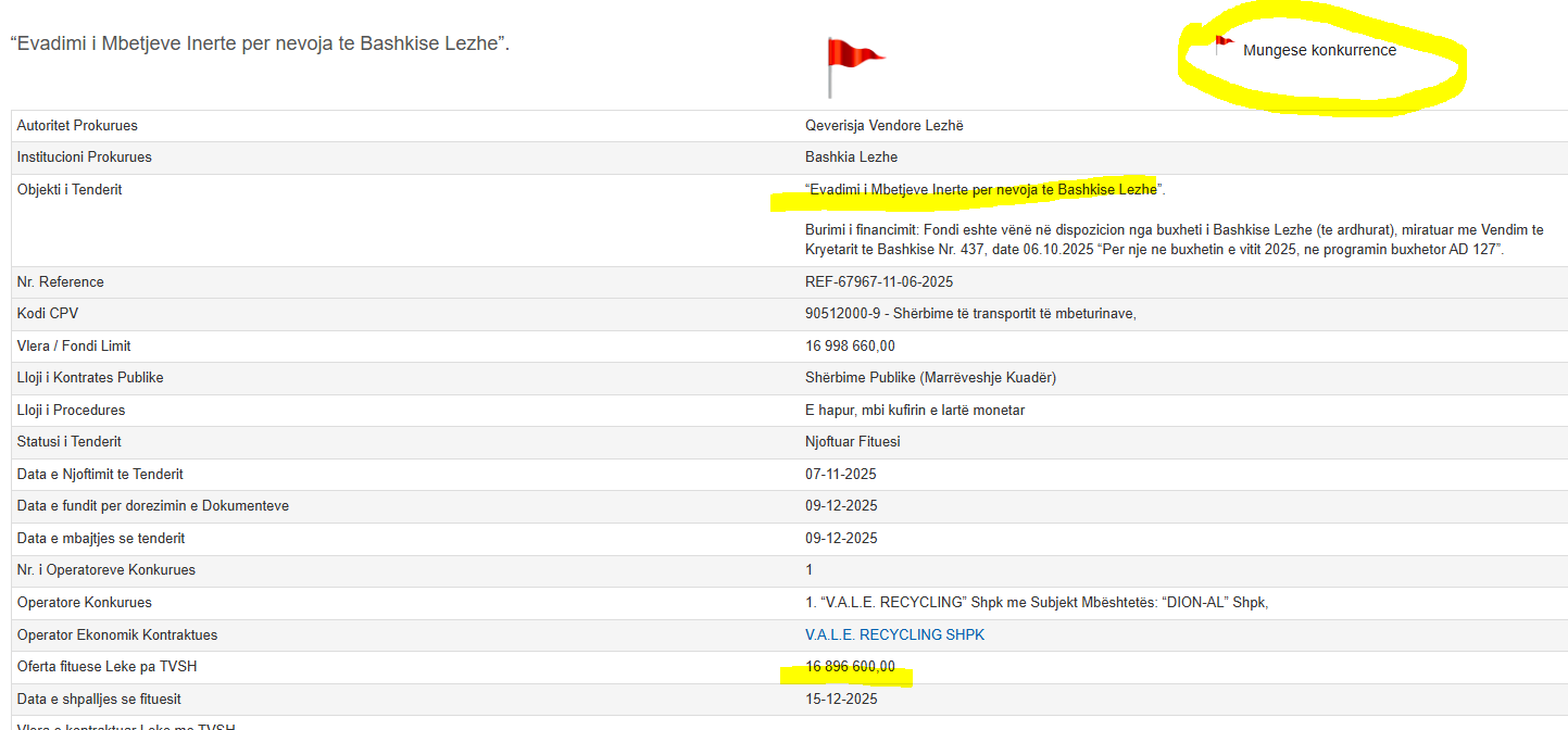 Edhe kjo procedurë është shënuar nga Open Data Albania me “Flamur të kuq” që sinjalizon risk korrupsioni. Tenderi është mbajtur më 9 dhjetor 2025 me vetëm një operator pjesëmarrës “V.A.L.E. RECYCLING” Shpk me Subjekt Mbështetës: “DION-AL” Shpk, ndërsa më 15 dhjetor 2025 është shpallur fituesi me firmën e Pjerin Ndreut.