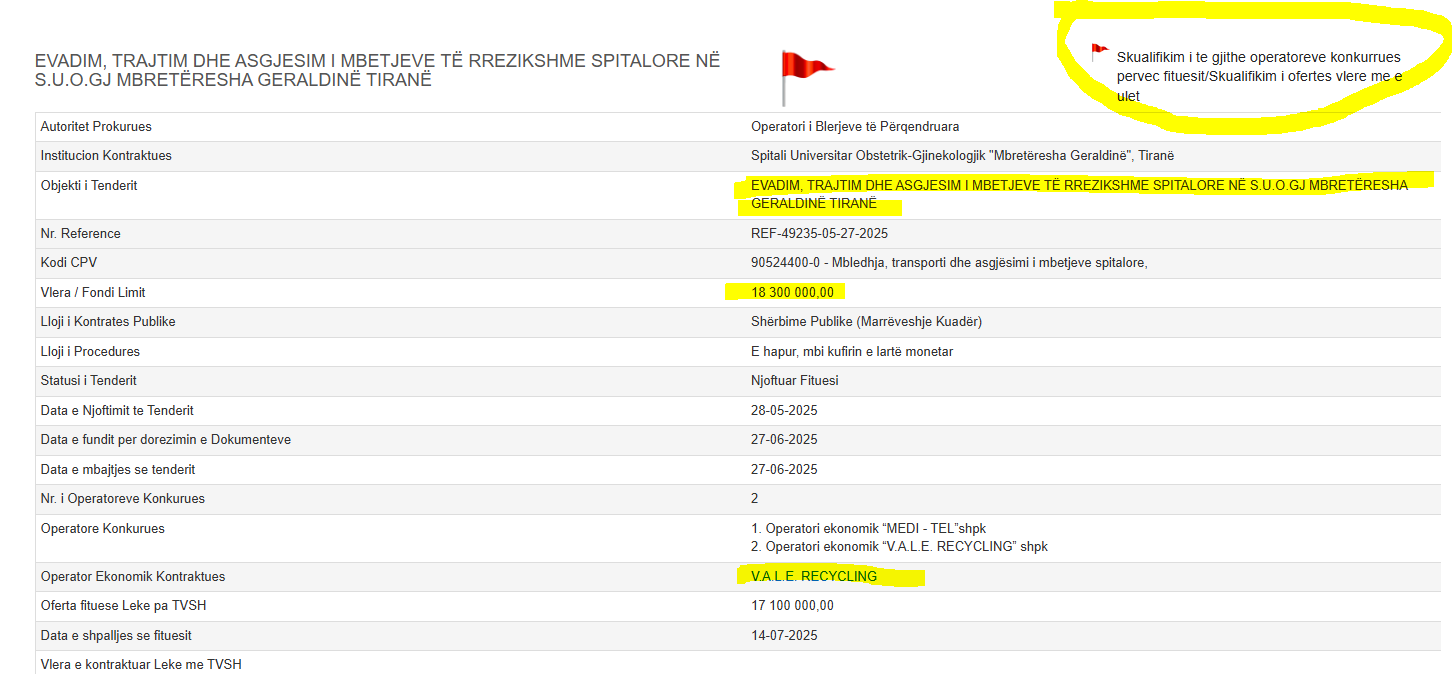 Objekti i tenderit është “Evadimi, trajtimi i mbetjeve spitalore” ku është lidhur kontrata me vlerë torale 2 851 200,00 lekë.