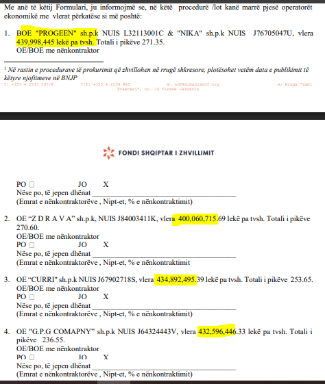 Kështu kompania “CURRI” sh.p.k ka ofertën me vlerë 434,892,495 lekë pa tvsh. Operatori ekonomik “G.P.G COMAPNY” sh.p.k propozon shifrën 432,596,446 lekë pa tvsh.