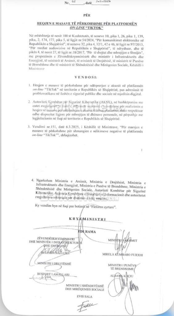 1. Heqjen e masave të përkohshme për ndërprerjen e aksesit në platformën on-line “Tik Tok” në territorin e Republikës së Shqipërisë, pas adresimit të problematikave në fushën e sigurisë publike dhe sociale në mjedisin digjital.