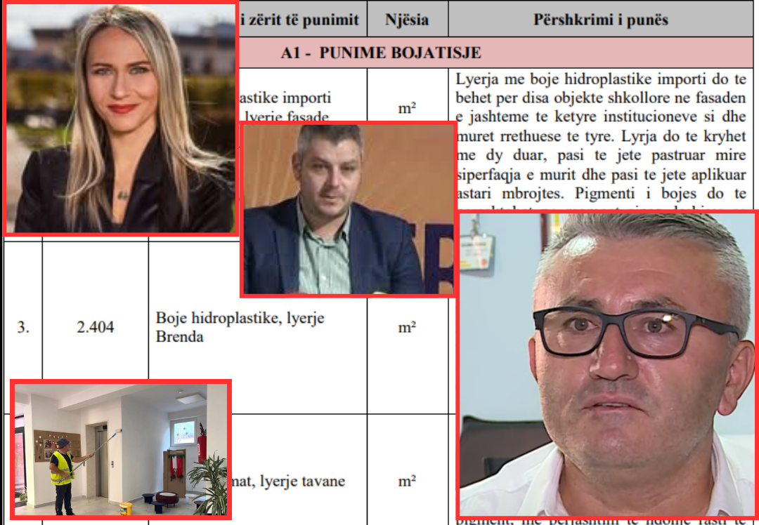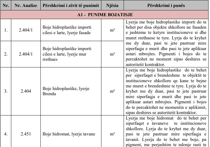Kontrata përshkruan furnizimin me bojë hidroplastike dhe lyerjen për disa objekte shkollore në fasadën e jashtme si dhe muret rrethuese te tyre. Lyrja do te kryhet me dy duar. Për pigmentin e bojës me siguri merret miratimi i kryeministrit. Po ashtu parashikohet lyerja e mureve të brendshme te tyre dhe tavanet.