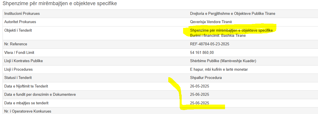 Më konkretisht, tenderi me objekt: “Shpenzime për mirëmbajtjen e objekteve specifike”, me fond limit 54,161,860.31 lekë pa TVSH, parashikuar për t’u zhvilluar në datën 25 qershor 2025 është futur në kalendat greke.