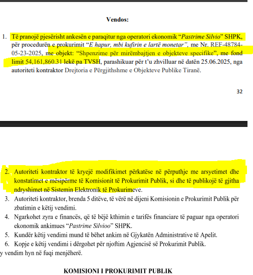 Kërkesa e kompanisë “Pastrime Silvio” është për modifikimin e dokumenteve të procedurës së prokurimit. “Shpenzime për mirëmbajtjen e objekteve specifike”. KPP e ka pranuar ankesën dhe me një vendim 34 faqe ka urdhëruar  Bashkinë Tiranë që të ndryshojë kriteret.
