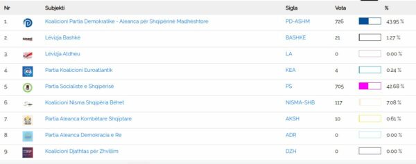 I dyti në radhë është Koalicioni Partia Demokratike – Aleanca për Shqipërinë Madhështore (PD-ASHM), i cili ka siguruar ka siguruar 26839 vota, që përbëjnë 35.14 %, ndërsa forcë e tretë renditet Partia Mundësia, e cila ka grumbulluar deri më tani 3756 vota, që përfaqësojnë 4.92 % të totalit të votave.