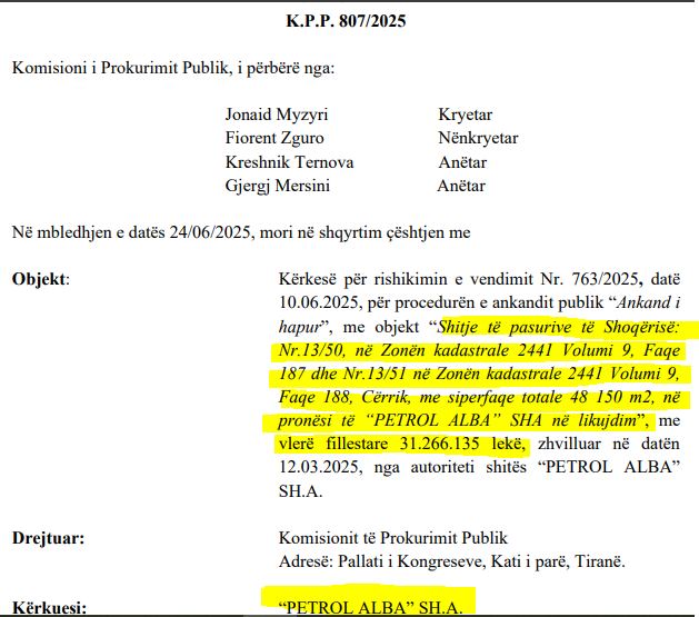 Më datë 17 shkurt 2025 është publikuar procedura “Ankand i hapur”, me objekt “Shitje të pasurive të Shoqërisë në Cërrik”, me sipërfaqe totale 48 150 m2, në pronësi të “PETROL ALBA” SHA në likujdim”, me vlerë fillestare 31.266.135 lekë. Ankandi është zhvilluar në 12 mars 2025.
